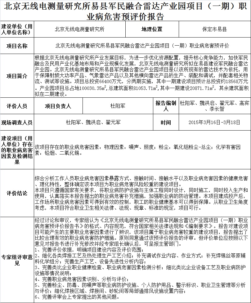 北京无线电测量研究所易县军民融合雷达产业园区项目(一期)建设项目职业病危害预评价
