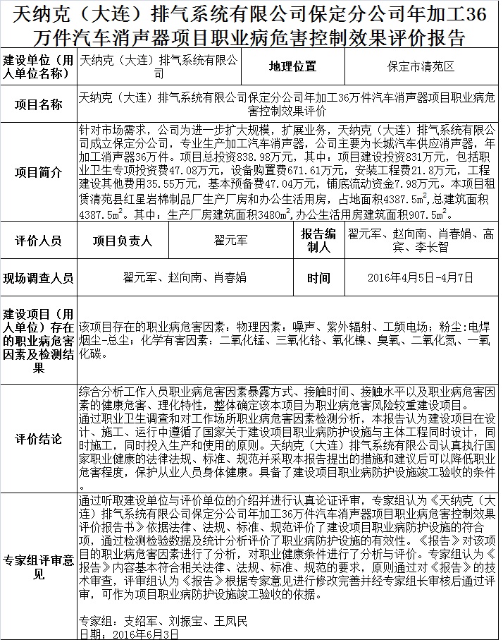 天纳克(大连)排气系统有限公司保定分公司年加工36万件汽车消声器项目职业病危害控制效果评价